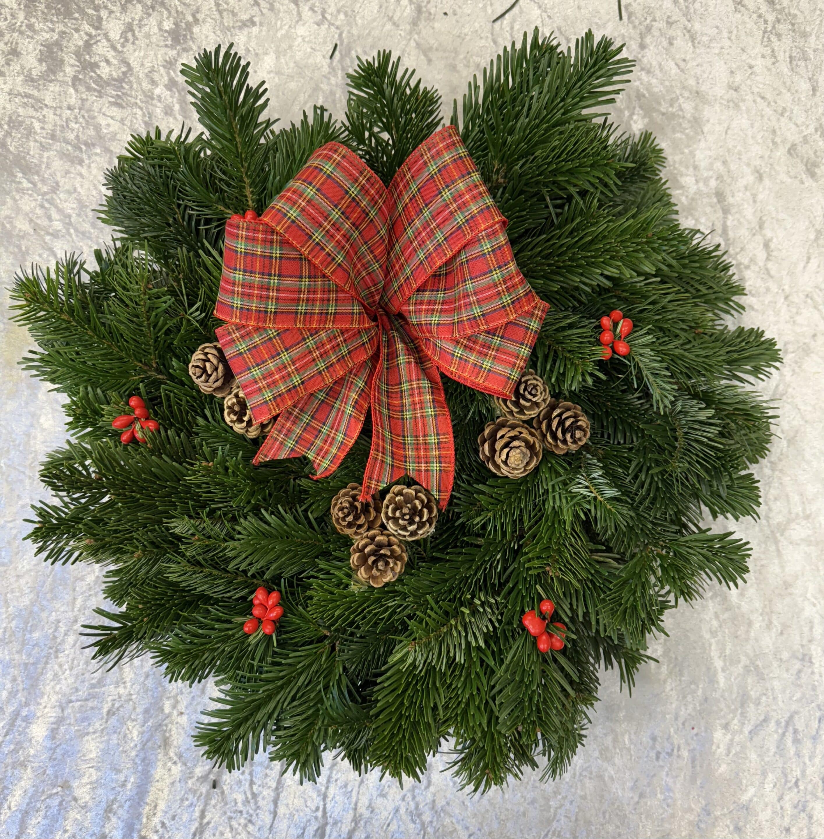 The Kilted Christmas Tree Co Festive Spice Fresh Christmas Wreath is a fantastic mixture of dried fruit, lotus heads, cinnamon sticks, and cones. Its Scottish Highland noble fir delivers a beautiful scent to enhance your festive home. Handmade in Kinross The sizing relates to the circumference of the metal wreath ring, add approximately another inch on either side for the lush foliage. Due to being a natural product size and design may vary slightly. For a selection of hangers click here Wreath Door Hanger – Kilted Christmas Tree Company